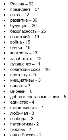 Например, часто употребляемые слова - «развитие» (36), «будущее» (26), «безопасность» (25), советский (19), «семья» (16), война (15), «ресурсы» (15), «контроль» (13), «заработать» (12), «протестун» (9).